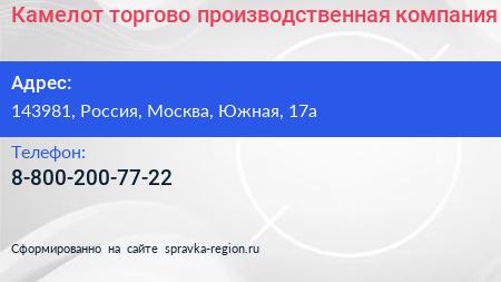 Камелот, торгово-производственная компания по адресу 143981, Россия, Москва, Южная, 17а в дальнейшем Организация, размещена в следующих категориях: