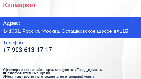 Келмаркет по адресу 141031, Россия, Москва, Осташковское шоссе, вл11Б в дальнейшем Организация, размещена в следующих категориях: