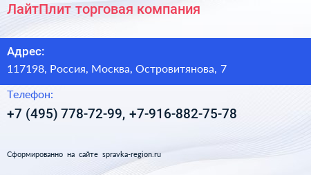 ЛайтПлит, торговая компания по адресу 117198, Россия, Москва, Островитянова, 7 в дальнейшем Организация, размещена в следующих категориях: