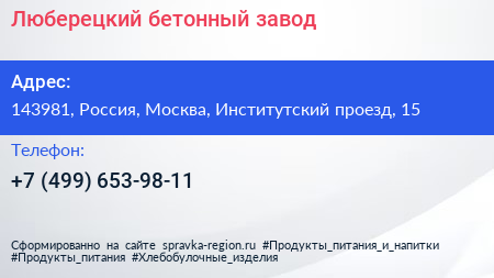 Люберецкий бетонный завод по адресу 143981, Россия, Москва, Институтский проезд, 15 в дальнейшем Организация, размещена в следующих категориях: