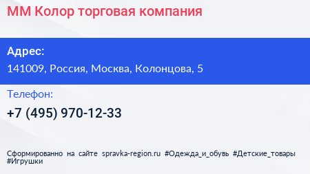 ММ-Колор, торговая компания по адресу 141009, Россия, Москва, Колонцова, 5 в дальнейшем Организация, размещена в следующих категориях: