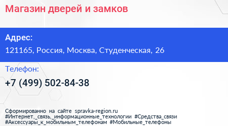 Магазин дверей и замков по адресу 121165, Россия, Москва, Студенческая, 26 в дальнейшем Организация, размещена в следующих категориях: