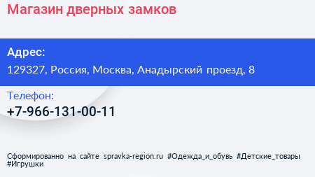 Магазин дверных замков по адресу 129327, Россия, Москва, Анадырский проезд, 8 в дальнейшем Организация, размещена в следующих категориях:
