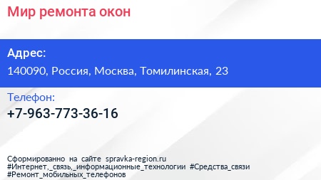 Мир ремонта окон по адресу 140090, Россия, Москва, Томилинская, 23 в дальнейшем Организация, размещена в следующих категориях: