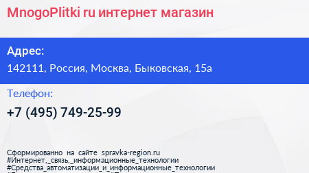 MnogoPlitki.ru, интернет-магазин по адресу 142111, Россия, Москва, Быковская, 15а в дальнейшем Организация, размещена в следующих категориях: