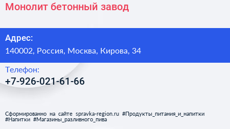 Монолит, бетонный завод по адресу 140002, Россия, Москва, Кирова, 34 в дальнейшем Организация, размещена в следующих категориях:
