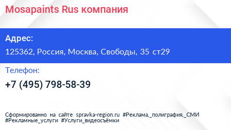 Mosapaints Rus, компания по адресу 125362, Россия, Москва, Свободы, 35 ст29 в дальнейшем Организация, размещена в следующих категориях: