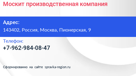 Москит, производственная компания по адресу 143402, Россия, Москва, Пионерская, 9 в дальнейшем Организация, размещена в следующих категориях: