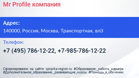 Mr.Profile, компания по адресу 140000, Россия, Москва, Транспортная, вл3 в дальнейшем Организация, размещена в следующих категориях: