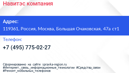 Навитэс, компания по адресу 119361, Россия, Москва, Большая Очаковская, 47а ст1 в дальнейшем Организация, размещена в следующих категориях: