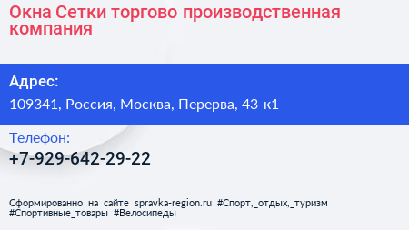 Окна & Сетки, торгово-производственная компания по адресу 109341, Россия, Москва, Перерва, 43 к1 в дальнейшем Организация, размещена в следующих категориях: