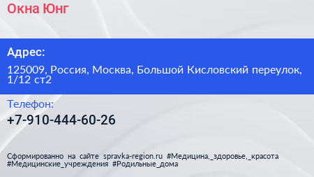Окна Юнг по адресу 125009, Россия, Москва, Большой Кисловский переулок, 1/12 ст2 в дальнейшем Организация, размещена в следующих категориях: