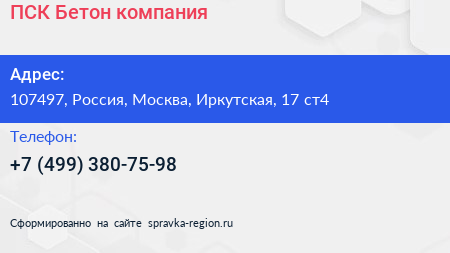 ПСК-Бетон, компания по адресу 107497, Россия, Москва, Иркутская, 17 ст4 в дальнейшем Организация, размещена в следующих категориях: