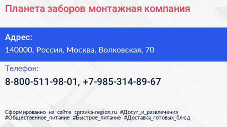 Планета заборов, монтажная компания по адресу 140000, Россия, Москва, Волковская, 70 в дальнейшем Организация, размещена в следующих категориях: