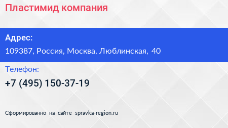 Пластимид, компания по адресу 109387, Россия, Москва, Люблинская, 40 в дальнейшем Организация, размещена в следующих категориях: