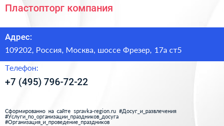 Пластопторг, компания по адресу 109202, Россия, Москва, шоссе Фрезер, 17а ст5 в дальнейшем Организация, размещена в следующих категориях: