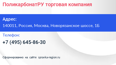 ПоликарбонатРУ, торговая компания по адресу 140011, Россия, Москва, Новорязанское шоссе, 1Б в дальнейшем Организация, размещена в следующих категориях:
