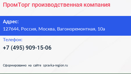 ПромТорг, производственная компания по адресу 127644, Россия, Москва, Вагоноремонтная, 10а в дальнейшем Организация, размещена в следующих категориях: