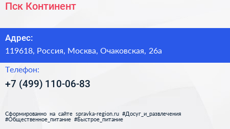 Пск Континент по адресу 119618, Россия, Москва, Очаковская, 26а в дальнейшем Организация, размещена в следующих категориях: