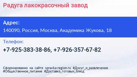 Радуга, лакокрасочный завод по адресу 140090, Россия, Москва, Академика Жукова, 18 в дальнейшем Организация, размещена в следующих категориях: