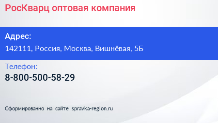РосКварц, оптовая компания по адресу 142111, Россия, Москва, Вишнёвая, 5Б в дальнейшем Организация, размещена в следующих категориях: