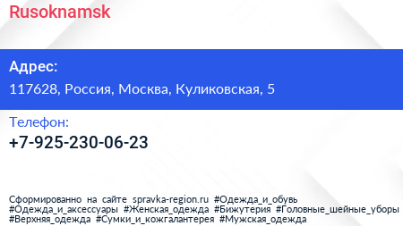 Rusoknamsk по адресу 117628, Россия, Москва, Куликовская, 5 в дальнейшем Организация, размещена в следующих категориях: