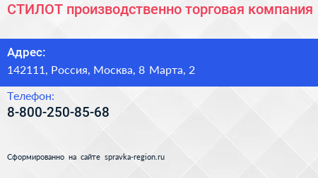 СТИЛОТ, производственно-торговая компания по адресу 142111, Россия, Москва, 8 Марта, 2 в дальнейшем Организация, размещена в следующих категориях: