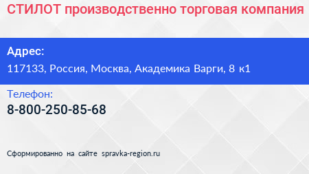 СТИЛОТ, производственно-торговая компания по адресу 117133, Россия, Москва, Академика Варги, 8 к1 в дальнейшем Организация, размещена в следующих категориях: