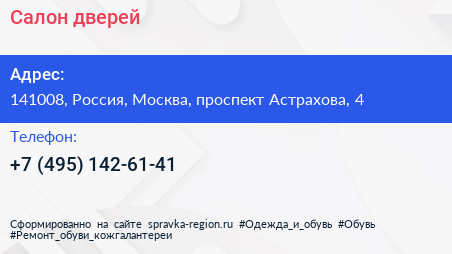 Салон дверей по адресу 141008, Россия, Москва, проспект Астрахова, 4 в дальнейшем Организация, размещена в следующих категориях: