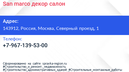 San marco, декор-салон по адресу 143912, Россия, Москва, Северный проезд, 1 в дальнейшем Организация, размещена в следующих категориях: