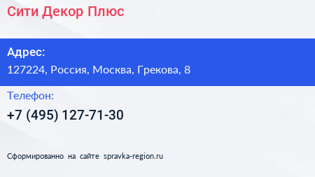 Сити Декор Плюс по адресу 127224, Россия, Москва, Грекова, 8 в дальнейшем Организация, размещена в следующих категориях: