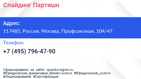 Слайдинг Партишн по адресу 117485, Россия, Москва, Профсоюзная, 104/47 в дальнейшем Организация, размещена в следующих категориях:
