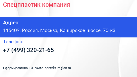Спецпластик, компания по адресу 115409, Россия, Москва, Каширское шоссе, 70 к3 в дальнейшем Организация, размещена в следующих категориях: