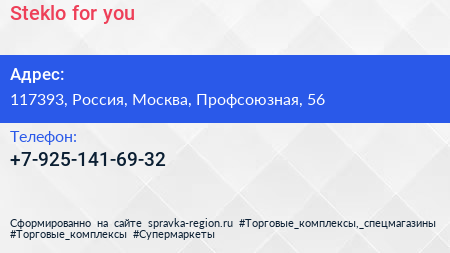 Steklo for you по адресу 117393, Россия, Москва, Профсоюзная, 56 в дальнейшем Организация, размещена в следующих категориях: