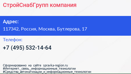 СтройСнабГрупп, компания по адресу 117342, Россия, Москва, Бутлерова, 17 в дальнейшем Организация, размещена в следующих категориях: