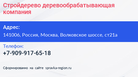 Стройдерево, деревообрабатывающая компания по адресу 141006, Россия, Москва, Волковское шоссе, ст21а в дальнейшем Организация, размещена в следующих категориях: