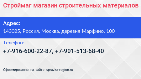 Строймаг, магазин строительных материалов по адресу 143025, Россия, Москва, деревня Марфино, 100 в дальнейшем Организация, размещена в следующих категориях:
