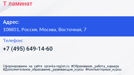 Т-ламинат по адресу 108851, Россия, Москва, Восточная, 7 в дальнейшем Организация, размещена в следующих категориях: