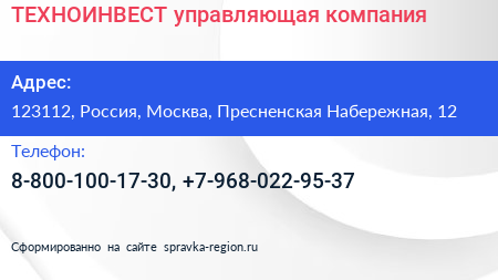 ТЕХНОИНВЕСТ, управляющая компания по адресу 123112, Россия, Москва, Пресненская Набережная, 12 в дальнейшем Организация, размещена в следующих категориях: