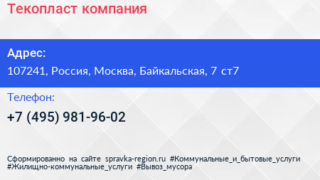Текопласт, компания по адресу 107241, Россия, Москва, Байкальская, 7 ст7 в дальнейшем Организация, размещена в следующих категориях: