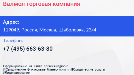 Валмол, торговая компания по адресу 119049, Россия, Москва, Шаболовка, 23/4 в дальнейшем Организация, размещена в следующих категориях: