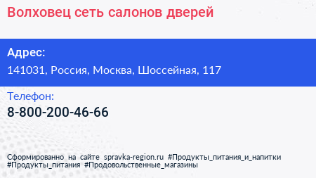 Волховец, сеть салонов дверей по адресу 141031, Россия, Москва, Шоссейная, 117 в дальнейшем Организация, размещена в следующих категориях: