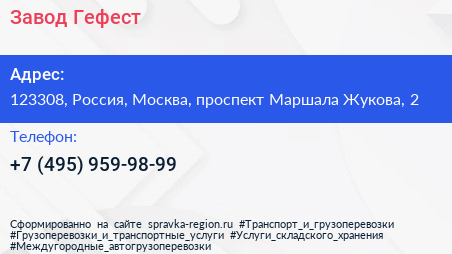 Завод Гефест по адресу 123308, Россия, Москва, проспект Маршала Жукова, 2 в дальнейшем Организация, размещена в следующих категориях: