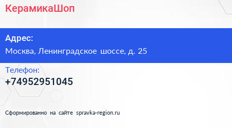 КерамикаШоп по адресу Москва, Ленинградское шоссе, д. 25 в дальнейшем Организация, размещена в следующих категориях: