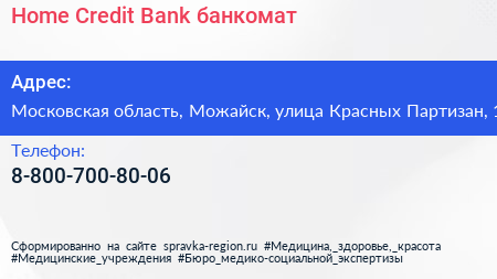 Home Credit Bank, банкомат по адресу Московская область, Можайск, улица Красных Партизан, 1 в дальнейшем Организация, размещена в следующих категориях: