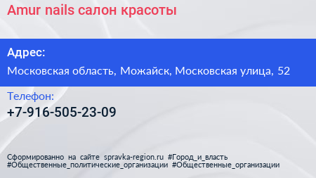 Amur nails, салон красоты по адресу Московская область, Можайск, Московская улица, 52 в дальнейшем Организация, размещена в следующих категориях: