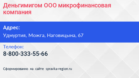 Деньгимигом, ООО, микрофинансовая компания по адресу Удмуртия, Можга, Наговицына, 67 в дальнейшем Организация, размещена в следующих категориях: