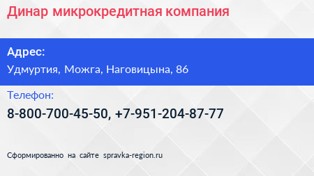Динар, микрокредитная компания по адресу Удмуртия, Можга, Наговицына, 86 в дальнейшем Организация, размещена в следующих категориях: