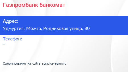 Газпромбанк, банкомат по адресу Удмуртия, Можга, Родниковая улица, 80 в дальнейшем Организация, размещена в следующих категориях:
