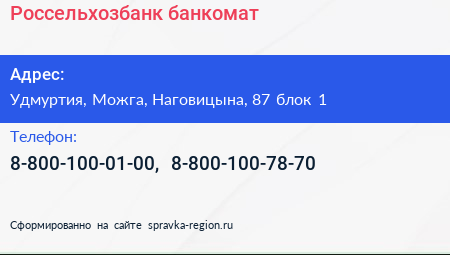 Россельхозбанк, банкомат по адресу Удмуртия, Можга, Наговицына, 87 блок 1 в дальнейшем Организация, размещена в следующих категориях: